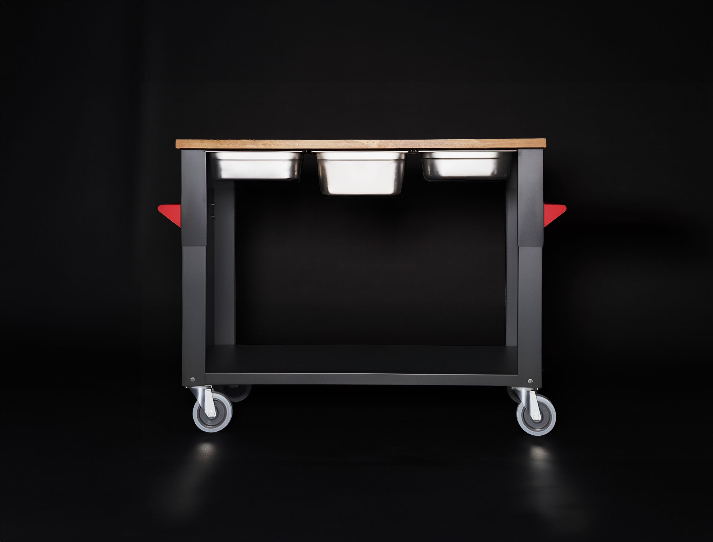 Der Grilltisch verfügt über drei Schienen für Gastronormbehälter. So kannst du von beiden Seiten Behälter nutzen. Damit wird das Arbeiten noch praktischer.